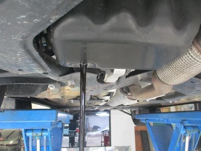 車両をリフトアップしてエンジンオイルパンのドレンボルトを取り外し、オイルを排出します。
